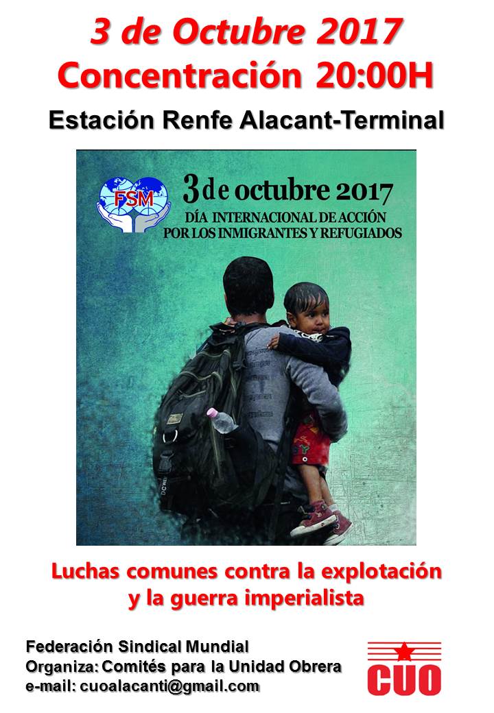 El CUO d’Alacantí convoca una concentración el martes 3 de octubre de 2017 a las 20:00H en la estación de Renfe-Alacant Terminal en torno al 3 de octubre, día internacional de acción de la Federación Sindical Mundial en su 72 aniversario por los inmigrantes y refugiados.