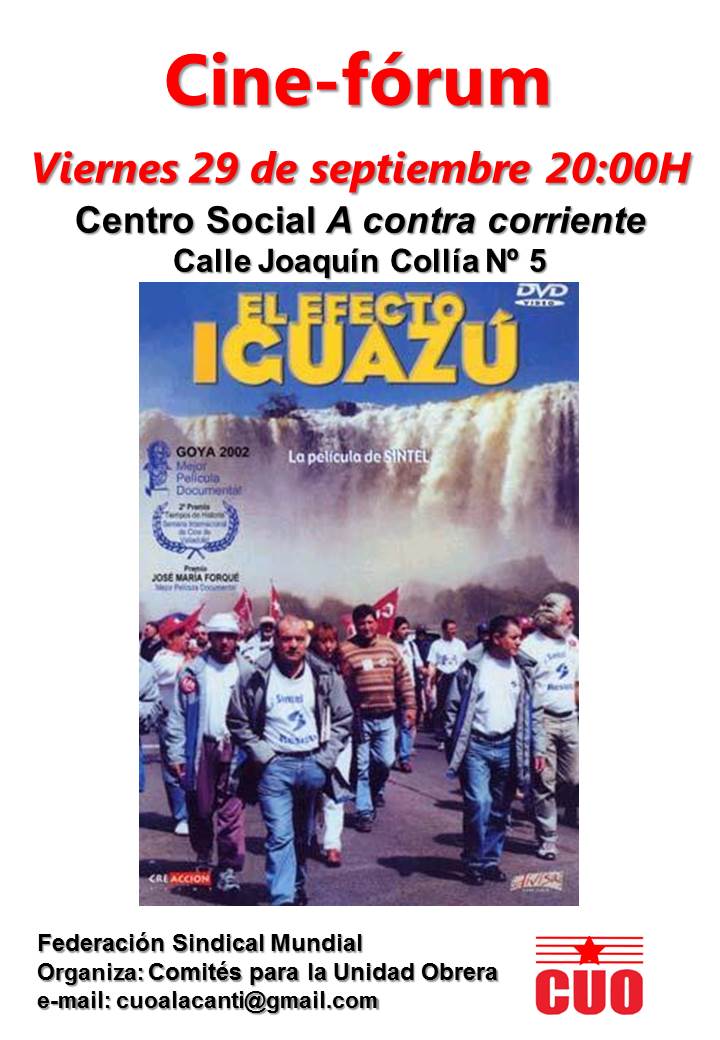 El CUO d’Alacantí organiza el cine-fórum Efecto Iguazú el viernes 29 de septiembre 20:00H en el Centro Social A contra corriente situado en la Calle Joaquín Collía Nº 5 en torno al 3 de octubre, día internacional de la Federación Sindical Mundial en su 72 aniversario por los inmigrantes y refugiados.