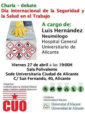 El CUO de l’Alacantí organiza una charla sobre el Día Internacional de la Seguridad y Salud en el Trabajo el viernes 27 de abril a las 19 h en la sala polivalente de la Sede Universitaria Ciudad de Alicante en la calle San Fernando nº 40 de Alicante.