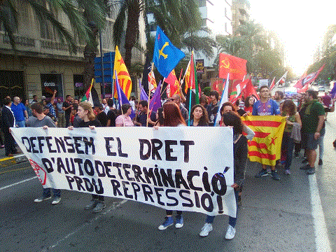 Los Comités para la Unidad Obrera han participado, junto con otras organizaciones, en una importante manifestación en Alicante por la defensa del derecho a la autodeterminación del pueblo trabajador, en este caso, en Solidaridad con la clase obrera de Catalunya. La manifestación comenzó en la Plaza Luceros continuó por la Avenida de Alfonso X el sabio y terminó al final de la Rambla. La manifestación transcurrió combativa y con marcado carácter de clase, en la que se gritaron consignas tales como “STOP repressió, autodeterminació”, “Que visca la lluita de la classe obrera!” y “L'únic terrorista és l'estat capitalista”, entre otras.