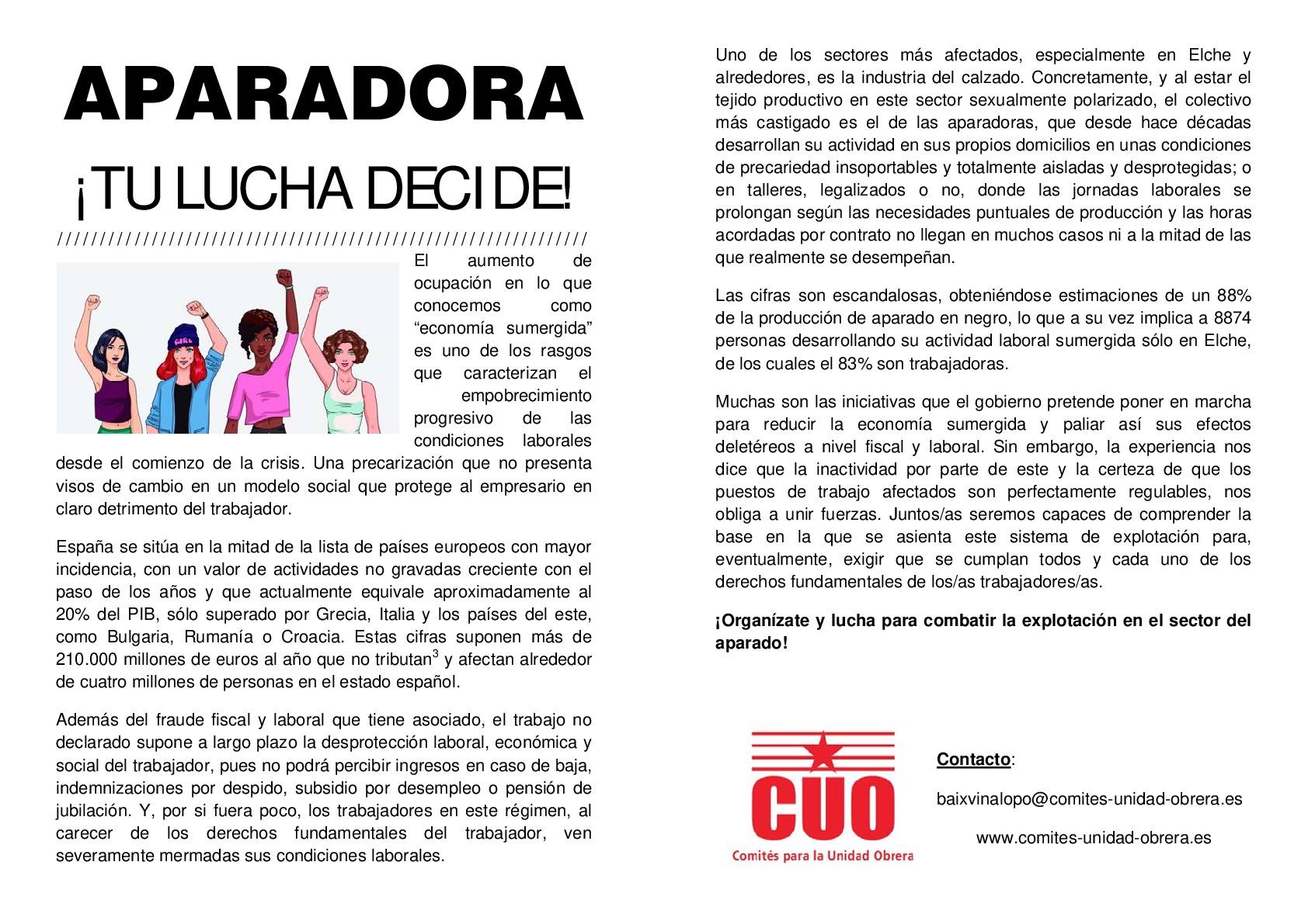 El Comité para la Unidad Obrera del Baix Vinalopó ha comenzado en la primera pegada de carteles y reparto de panfletos, denunciando la situación del sector de las aparadoras. En estos documentos se pone de manifiesto los perjuicios que esconde la economía sumergida, dando un panorama general de la misma en el Estado español, haciendo hincapié en la provincia de Alicante y denunciando la situación concreta en la que se encuentra el sector del aparado en la ciudad de Elche.