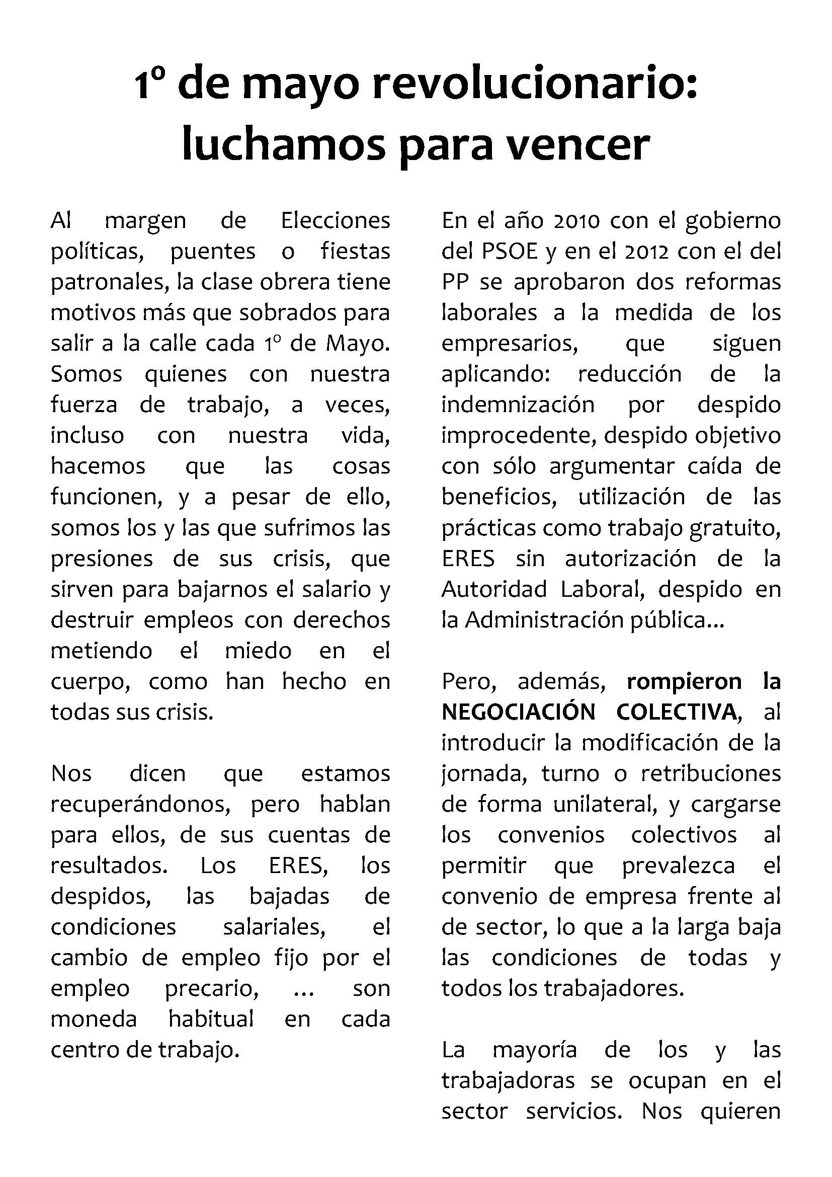 Al margen de Elecciones políticas, puentes o fiestas patronales, la clase obrera tiene motivos más que sobrados para salir a la calle cada 1o de Mayo. Somos quienes con nuestra fuerza de trabajo, a veces, incluso con nuestra vida, hacemos que las cosas funcionen, y a pesar de ello, somos los y las que sufrimos las presiones de sus crisis, que sirven para bajarnos el salario y destruir empleos con derechos metiendo el miedo en el cuerpo, como han hecho en todas sus crisis.