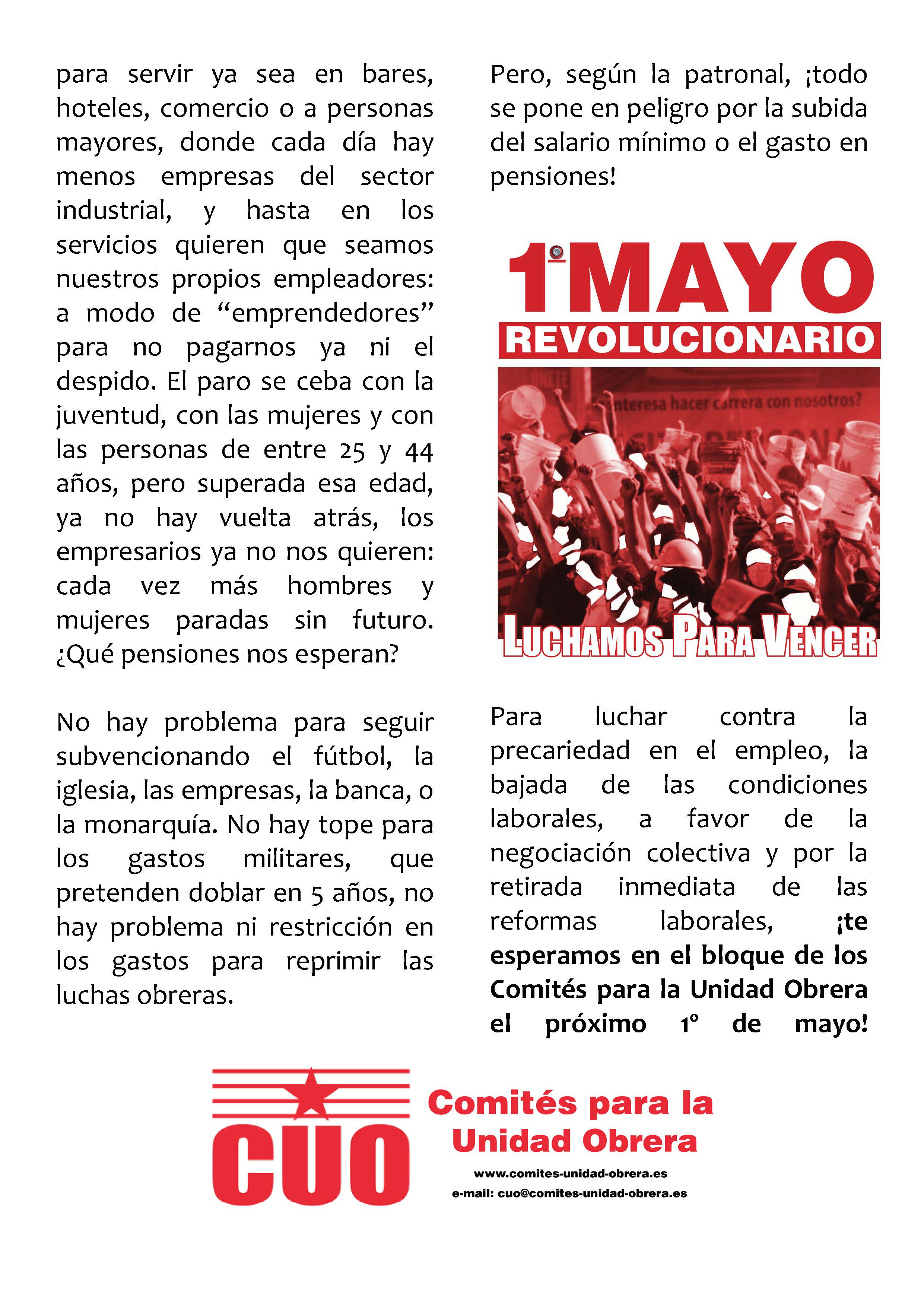 Para luchar contra la precariedad en el empleo, la bajada de las condiciones laborales, a favor de la negociación colectiva y por la retirada inmediata de las reformas laborales, ¡te esperamos en el bloque de los Comités para la Unidad Obrera el próximo 1º de mayo!