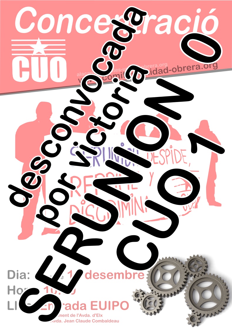 Pero SERUNION no contó con que la trabajadora despedida estaba organizada y no se iba a conformar con esperar paciente en casa la fecha del juicio, iba a hacer pública la actitud de esta empresa con sus trabajadoras/es. Por eso se convocó a través de los CUO (COMITÉS PARA LA UNIDAD OBRERA) concentraciones el martes 10, el jueves 12 y el domingo 15 de diciembre, con reparto de una hoja informativa, en la entrada de la EUIPO, que es donde se presta el servicio. Esos días donde la empresa no respondía al teléfono, donde le decían a la trabajadora despedida que no querían saber nada, donde te trataban como una basura e incluso mentían diciendo que era el cliente quién la había despedido, se han transformado en petición de arreglar las cosas cuanto antes, ¡YA!, sin mirar el dinero, porque no quieren más concentraciones, su cliente, LA EUIPO, les ha dicho que lo arreglen. Esa prepotencia de jugar con la dignidad de trabajadores y trabajadoras, de cambiar horarios sin explicación, esa prepotencia con las plantillas, usándolas como clínex, debe acabar, y hoy, gracias a la movilización, el miedo ha cambiado de bando.