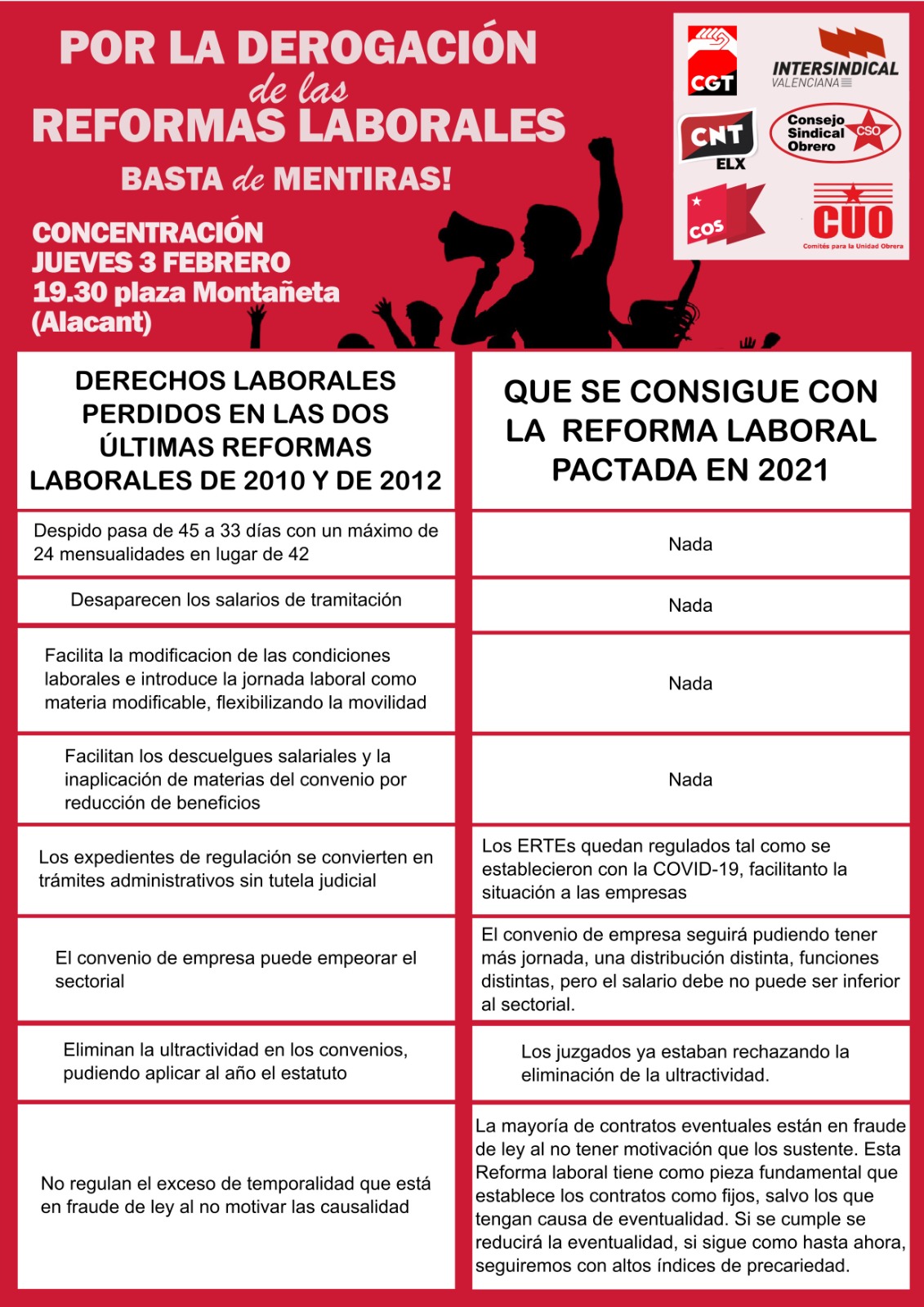 Los CUO de l'Alacantí se suman a la concentración por la derogación de las contra-reformas laborales que tendrá lugar el próximo jueves 3 de febrero a las 19:30h en la plaza de la Montañeta en Alacant.