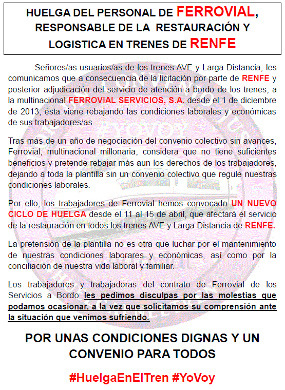Por ello, los y las trabajadoras están de huelga y concentrándose en las estaciones, explicando el justo motivo de sus reivindicaciones e informando a pasajeros y pasajeras que pueden reclamar parte del importe del billete si no se ofrece servicio y restaurante, si no hay video o audio y si no hay restauración en plaza de preferente.