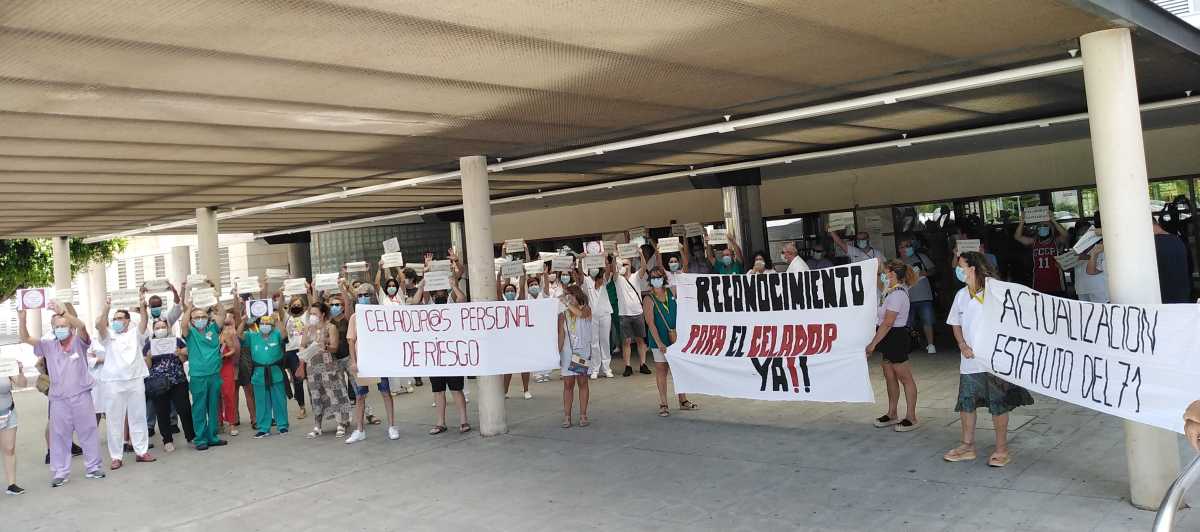 Los y las celadoras se han concentrado en el Hospital General Universitario de Alicante reivindicando la calificación de personal de riesgo puesto que la pandemia del COVID-19 ha deteriorado sus condiciones laborales y seguridad de manera notable.