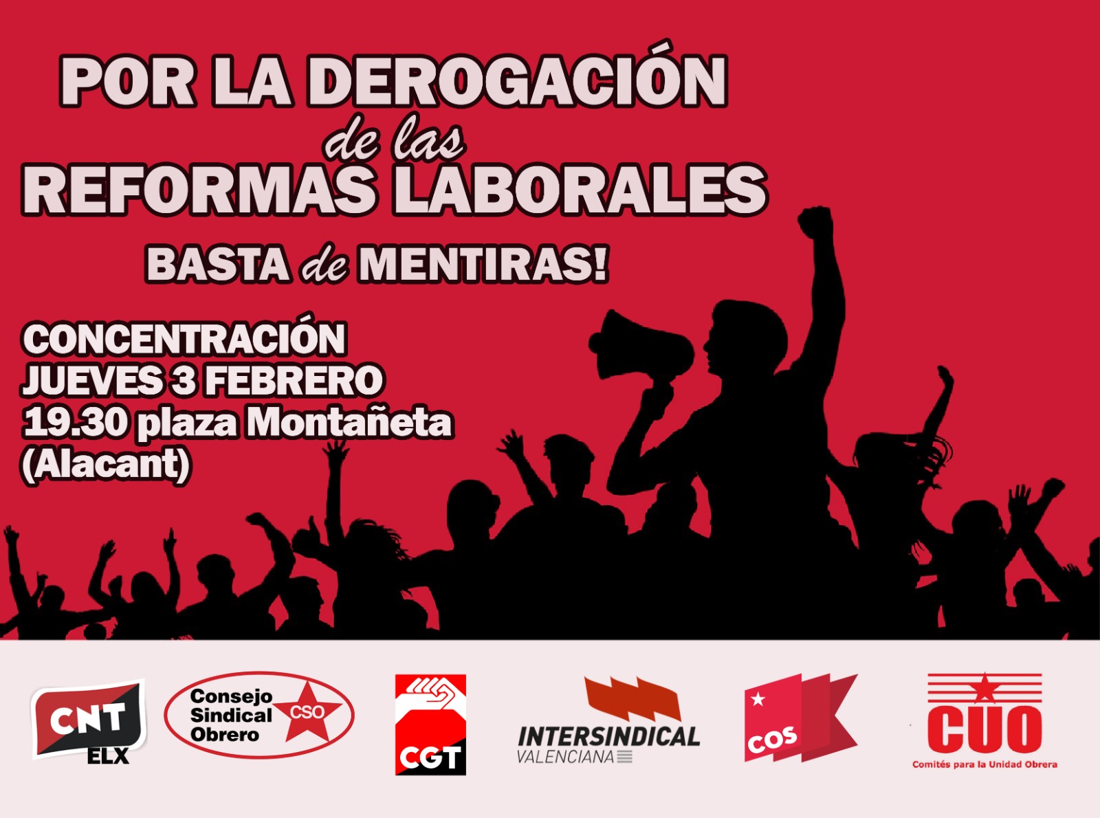 Los CUO de l'Alacantí se suman a la concentración por la derogación de las contra-reformas laborales que tendrá lugar el próximo jueves 3 de febrero a las 19:30h en la plaza de la Montañeta en Alacant.
