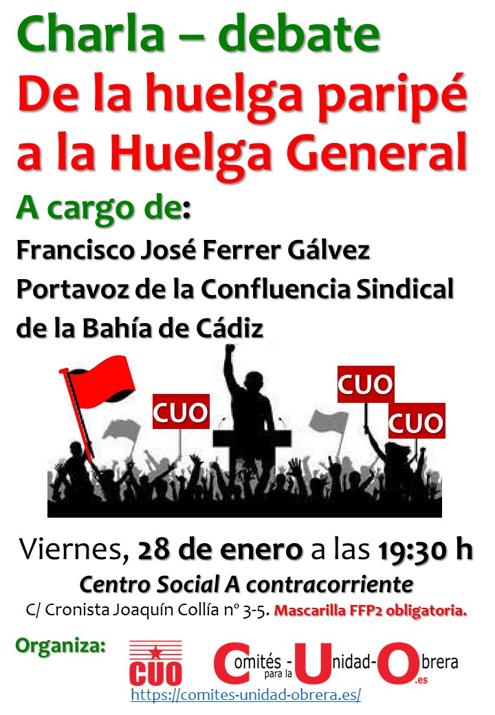 Los Comités para la Unidad Obrera de l’Alacantí presentan la charla – debate con título “De la huelga paripé a la Huelga General”, a cargo de Francisco José Ferrer Gálvez, portavoz de la Confluencia Sindical de la Bahía de Cádiz, que tendrá lugar el próximo viernes 28 de enero a las 19:30 h en el Centro Social A contracorriente sito en la calle Cronista Joaquín Collía n.º 3-5 en Alacant.