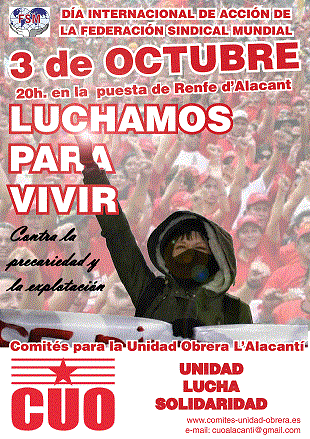 El 3 de octubre de 2018 celebramos el 73 aniversario de la Federación Sindical Mundial (FSM), organizando al pueblo trabajador para luchar contra la precariedad y la explotación, porque luchamos para vivir. Actualmente, nos encontramos con la acumulación de una serie de reformas laborales que han supuesto un incremento de los beneficios empresariales a costa de reducir los salarios y derechos de la clase obrera: más miseria para los y las que todo lo producimos y, sin embargo, no disponemos de los medios de producción.
