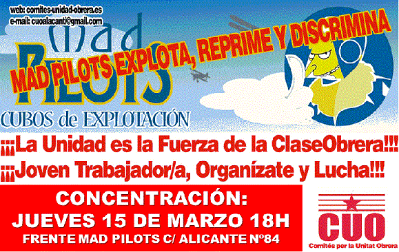 El próximo jueves 15 de marzo a las 18H, el CUO de l’Alacantí continúa con la serie de acciones de solidaridad contra los despidos de trabajadoras que reclaman que se cumplan los convenios colectivos en el sector de la hostelería, un claro caso de vulneración de derechos, en los bares “Mad Pilots” de Sant Vicent del Raspeig.