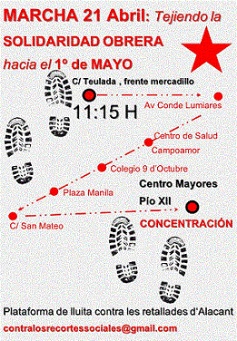 Los Comités para la Unidad Obrera de l'Alacantí participan junto con otras organizaciones en una marcha obrera el 21 de abril con el lema: tejiendo la solidaridad obrera hacia el 1º de mayo. Es una actividad que durante los últimos años han recorrido los barrios obreros de Alicante.