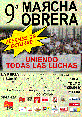 Los Comités para la Unidad Obrera de Gran Canaria se suman a la iniciativa que organiza el Partido Comunista del Pueblo Canario y más de 10 organizaciones (sindicales, comités de empresa, colectivos obreros y organizaciones sociales) convocantes más para movilizar a los trabajadores y trabajadoras de Gran Canaria el viernes 26 de Octubre en la Novena Marcha Obrera.
