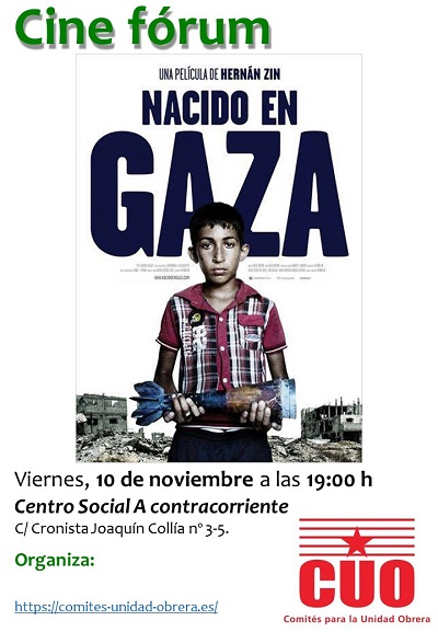 Los Comités para la Unidad Obrera de l’Alacantí proponen un cine-fórum el 10 de noviembre a las 19 h en el Centro Social A contracorriente (c\ Cronista Joaquín Collía nº 3-5, Alacant) proyectando el documental "Nacido en Gaza" que fue rodado entre entre julio y agosto de 2014, en el marco de la ofensiva israelí “Margen defensivo” con un balance de 507 niños y niñas muertas y más de 3.000 con heridas de guerra. El documental se narra con la voz de niños y niñas que han sufrido en primera persona los estragos de los ataques de Israel a la población palestina.