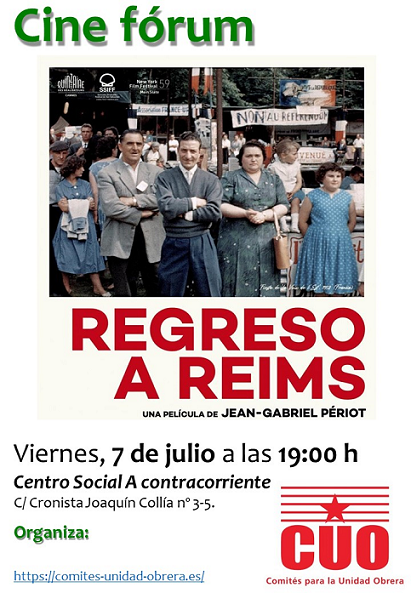Los Comités para la Unidad Obrera de l’Alacantí proponen un cine-fórum el 7 de julio a las 19 h en el Centro Social A contracorriente (c\ Cronista Joaquín Collía nº 3-5, Alacant) proyectando la película "Regreso a Reims" (Francia, 2021) que, en formato documental y con una voz de mujer de fondo, narra y vincula la propia historia familiar con la Historia de la clase obrera francesa desde principios de la década de 1950 hasta la actualidad.