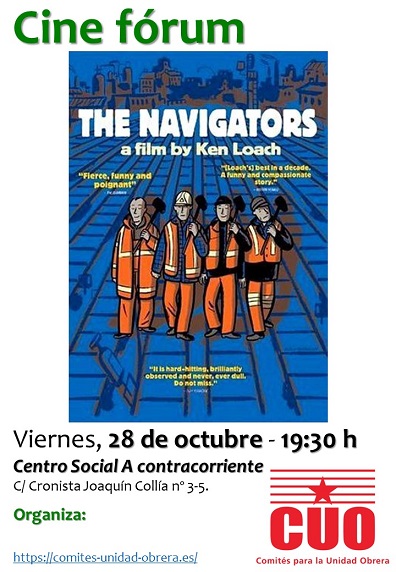 Los CUO de L'Alacantí organizan el viernes 28 de octubre a las 19:30 h en el Centro Social a Contracorriente (C/ Cronista Joaquín Collía nº 3-5) un cine-fórum. Se tratará la privatización de los servicios públicos y sus consecuencias negativas tanto en la prestación de tales servicios como en las condiciones laborales de la clase obrera.