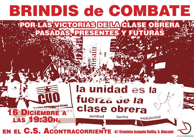Los CUO de L’Alacantí os invitan a un “Brindis de combate por las victorias de la clase obrera pasadas, presentes y futuras” el viernes 16 de diciembre a las 19:30 h en el Centro Social A contracorriente (C/ Cronista Joaquín Collía nº 3-5).