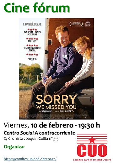 Los CUO de L'Alacantí organizan el viernes 10 de febrero a las 19:30 h en el Centro Social a Contracorriente (C/ Cronista Joaquín Collía nº 3-5) un cine-fórum.