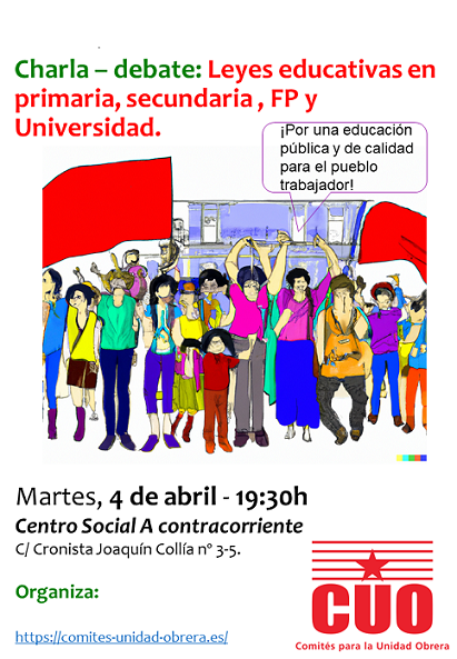 Los CUO de L’Alacantí han organizado una charla – debate sobre leyes educativas en primaria, secundaria, FP y universidad el martes 4 de abril a las 19:30 h en el Centro Social A contracorriente (C/ Cronista Joaquín Collía nº 3-5).